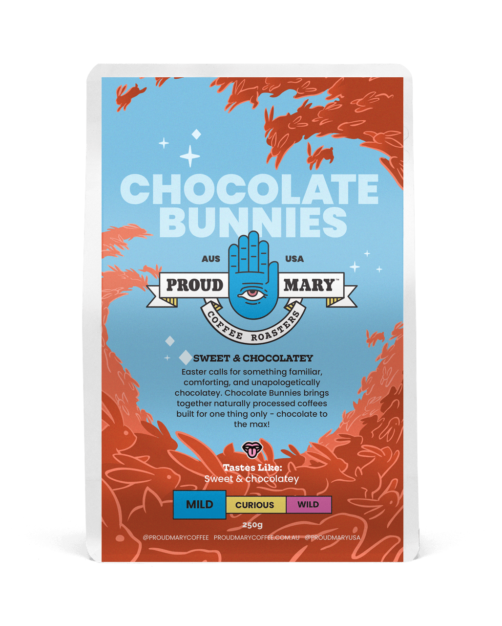 Chocolate Bunnies evokes memories of Easter morning, hunting around the house for eggs with chocolate inside ... or maybe finding a basket with a chocolate bunny you eat, starting ears first! You deserve to feel that in a coffee!